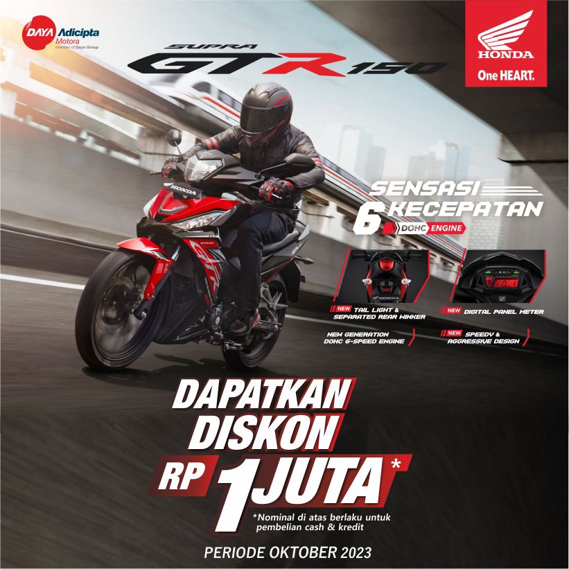 SENSASI 6 KECEPATAN. Dapatkan penawaran khusus potongan Rp 1 Juta untuk setiap pembelian Supra GTR selama bulan Oktober 2023. S&K Berlaku.