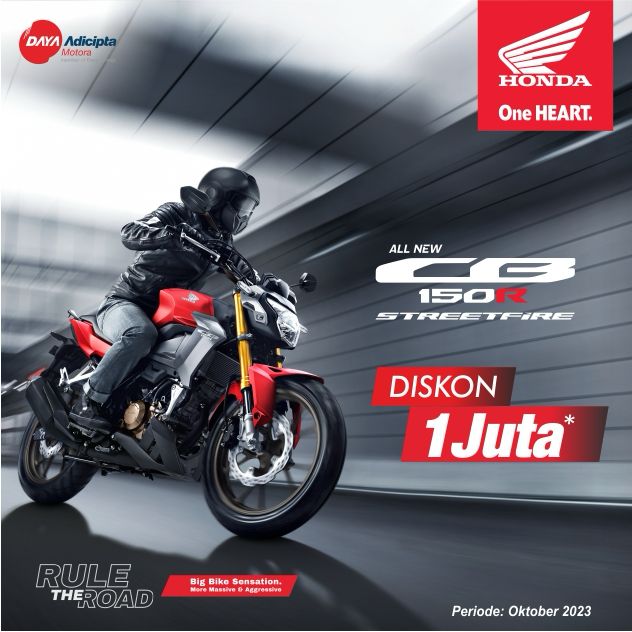 RULE THE WORLD. Dapatkan penawaran khusus potongan Rp 1 Juta untuk setiap pembelian CB150R selama bulan Oktober 2023. S&K Berlaku.