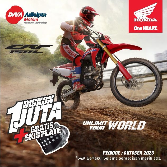 UNLIMIT YOUR WORLD. Dapatkan Diskon 1 Juta dan Skid Plate CRF150L untuk setiap pembelian CRF150L di periode Oktober 2023. S&K Berlaku.